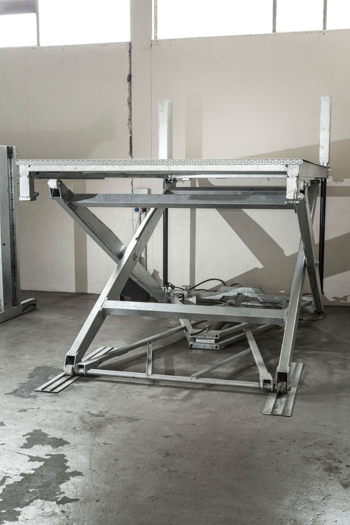 Elevatore per auto a comando elettrico con movimentazioni oleodinamiche per traslazione di autovetture tra piani definiti a pantografo senza coperchio di chiusura fossa