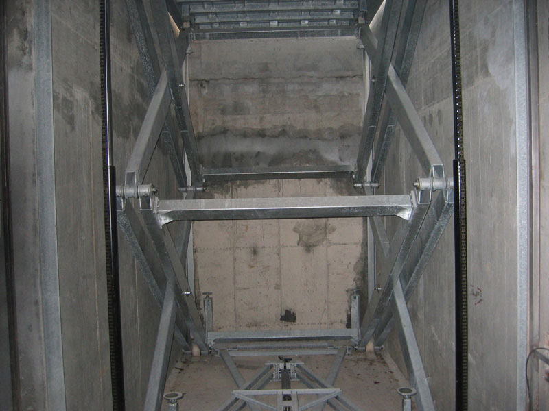 Ascensore per auto, montauto, elevatore per auto a comando elettrico con movimentazioni oleodinamiche per traslazione di autovetture tra piani definiti a pantografo senza coperchio di chiusura fossa
