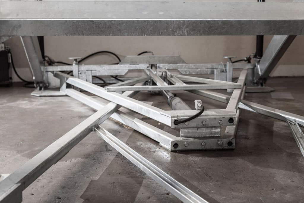 Elevatore per auto a comando elettrico con movimentazioni oleodinamiche per traslazione di autovetture tra piani definiti a pantografo senza coperchio di chiusura fossa
